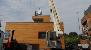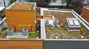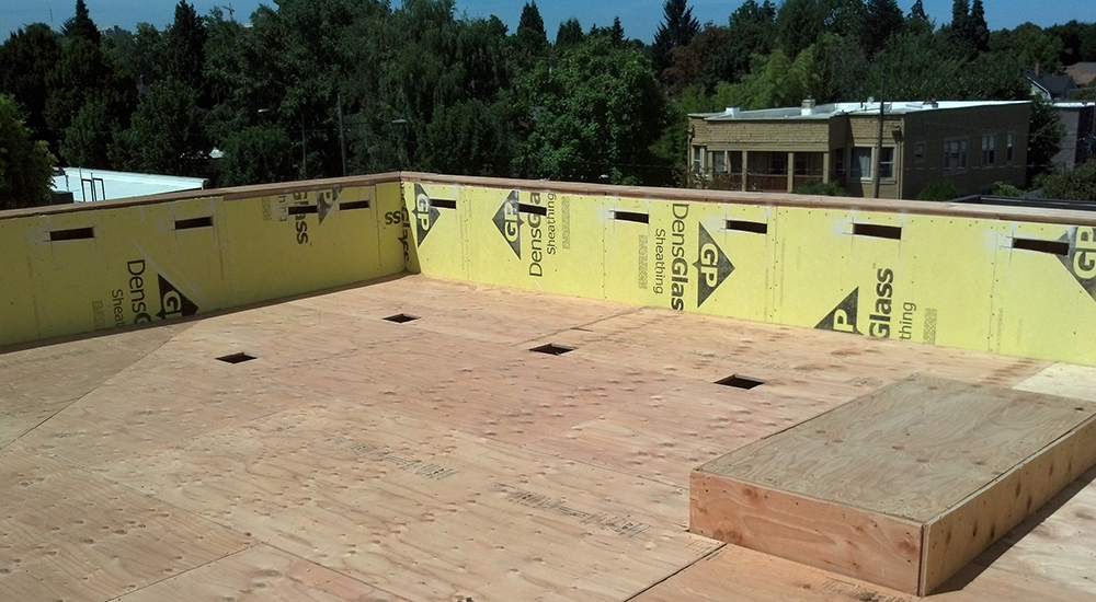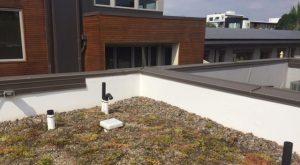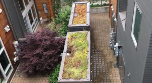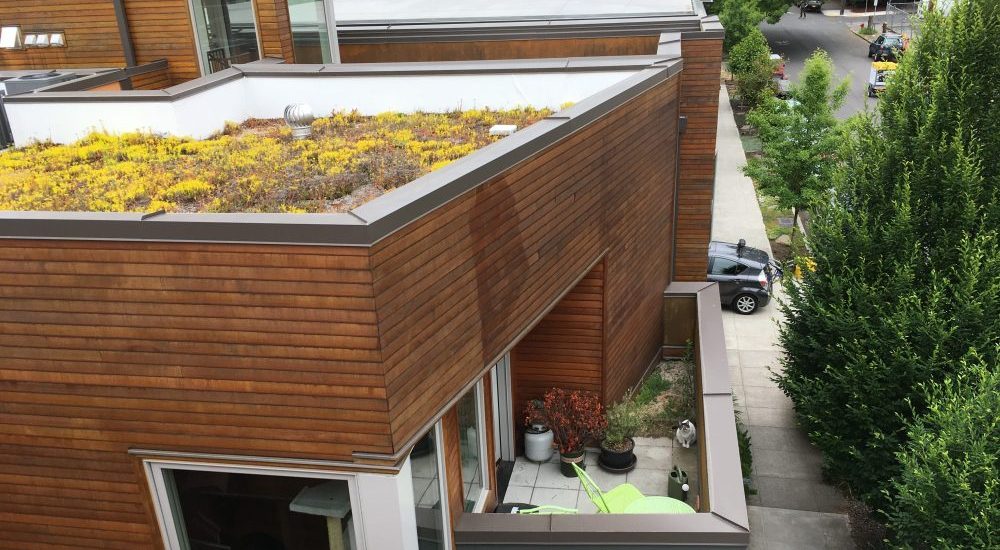 Built in two phases, in 2013 and 2016, this multi-family residence constructed in the high-density Buckman neighborhood, extended all the way to the property line, eliminating space at ground level for a stormwater facility. Designed to accommodate an ecoroof to manage stormwater, Ecoroofs Oregon worked closely with the architect to create repeatable details/construction assemblies that were duplicated throughout the project to hold the ecoroof. The roof’s design is typical of the stormwater facilities required by the City of Portland, 4″ thick medium planted in sedum. In 2016, patios, made of 2′ square concrete pavers on pedestals, were included to add outdoor living space for residents.