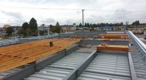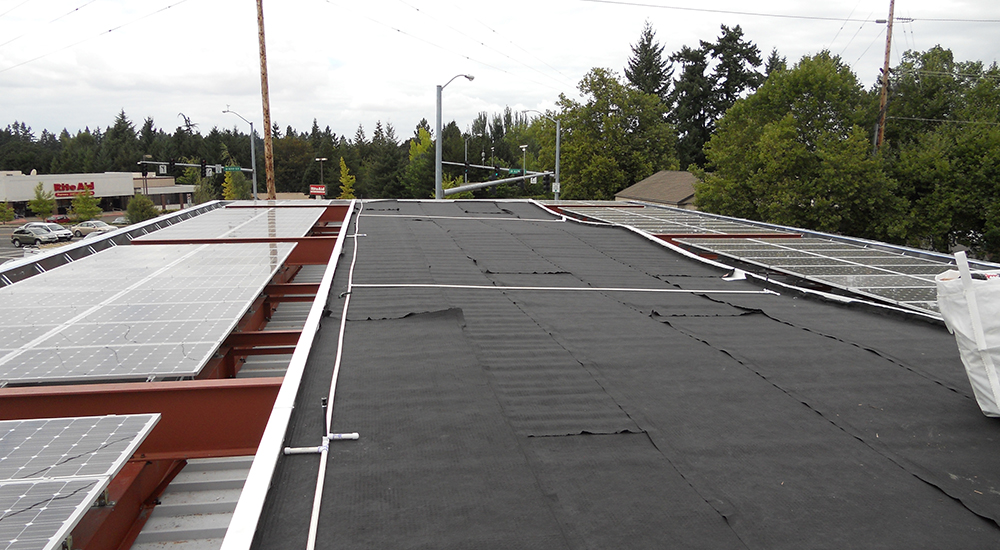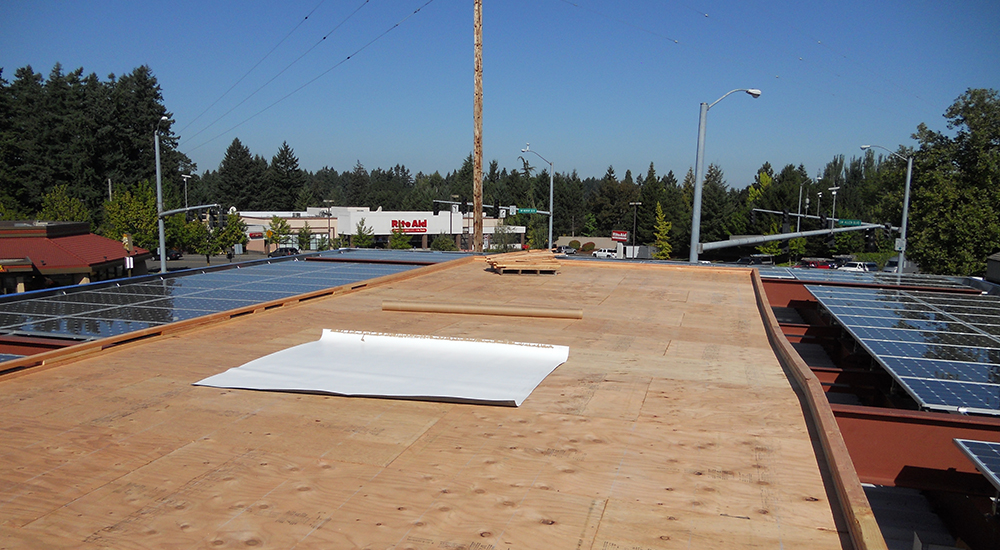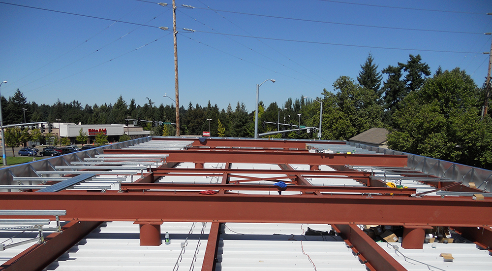 Ecoroofs Oregon assisted with concept development and design of these projects, and worked with the engineer to calculate the finish-weight of the entire assembly, framing, roofing, and ecoroof. The challenge was how to place 25 tons of ecoroof materials on top of a gas station canopy supported by four free-standing steel columns. As this was the first ecoroof for the City of Beaverton, we worked with the city on the stormwater facility aspects of the project, which offset the on-site landscape requirements, and facilitated the permitting and engineering of the project. Our scope of work included all framing above the steel canopy, membrane, roof drainage system, and irrigation.