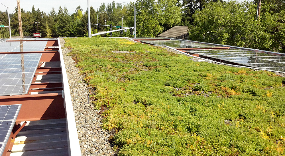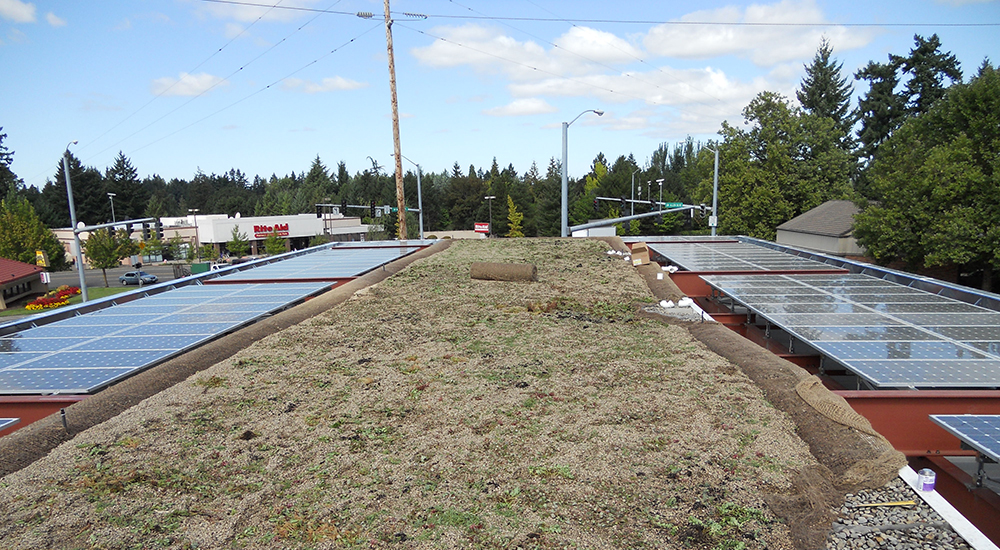 The Beaverton ExtraMile Chevron’s 1,750 square foot green roof, built over its pump station in 2010, was installed adjacent to 180 solar panels which meet about a third of the station’s energy needs. The green roof canopy absorbs about 43,000 gallons of rain annually.