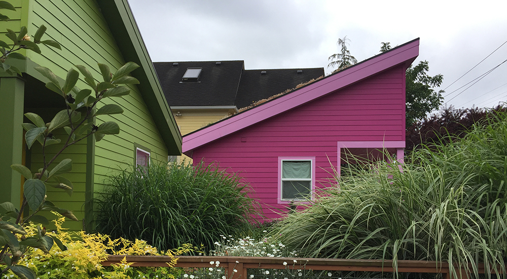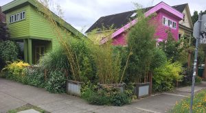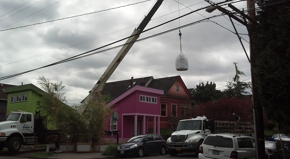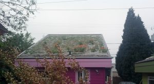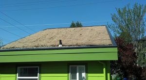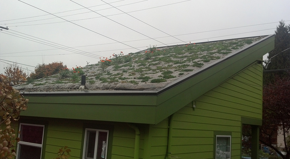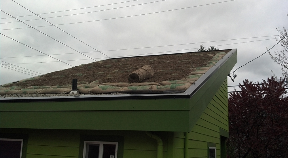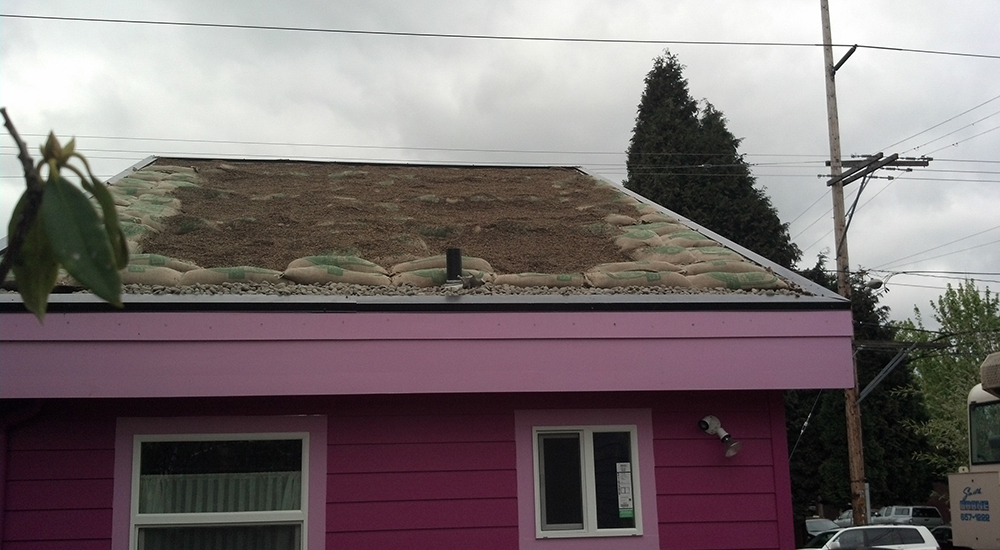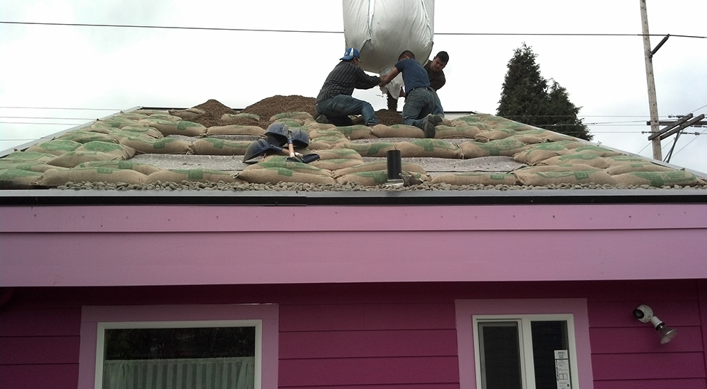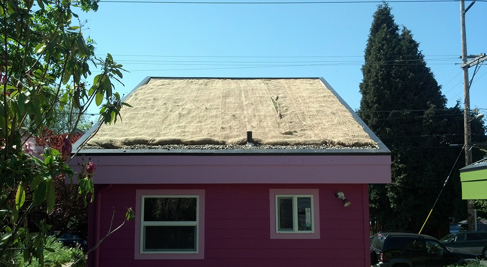 The clients building these two North Portland infill mini-cottages for the rental market wanted to extend the garden to the roof.  Our team added detailing to the 22° sloped roof to support the ecoroof and membrane, and loaded soil in burlap sacks to give structure to the soil and mitigate erosion. Sedum and other plantings were added, then covered with jute erosion control fabric. By covering the buildings, we eliminated all the impervious surfaces on the lot, which met the owner’s objective.