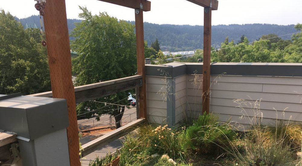 Clients in this St. John’s condominium project wanted to enhance an upper floor deck with a rooftop garden and trellis. In the process of repairing the roof membrane, Ecoroofs Oregon converted most of the area previously in deck space to garden, using the remaining decking materials to build a trellis.