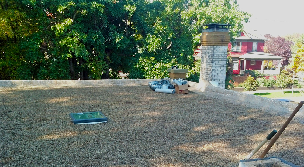 The clients who owned this 1927 historic district home in NE Portland wanted an ecoroof, but the roof of the house would not support the additional load. We hired an engineer, draftsman to assess and document existing building then installed new shear walls and concrete footings to support new roof framing and the seismic load of the new ecoroof which was 19 tons of ecoroof soil. Structural elements included concrete footings, shear walls with strap hold-downs and new roof structure (all new framing, sheathing), and new membrane and parapet cap flashing.