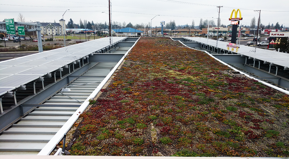 In 2014, a second Chevron station in the I-5 corridor in Woodburn, was converted to a net zero station, this time incorporating a 1,900 square foot sedum roof with solar panels.