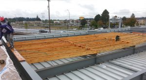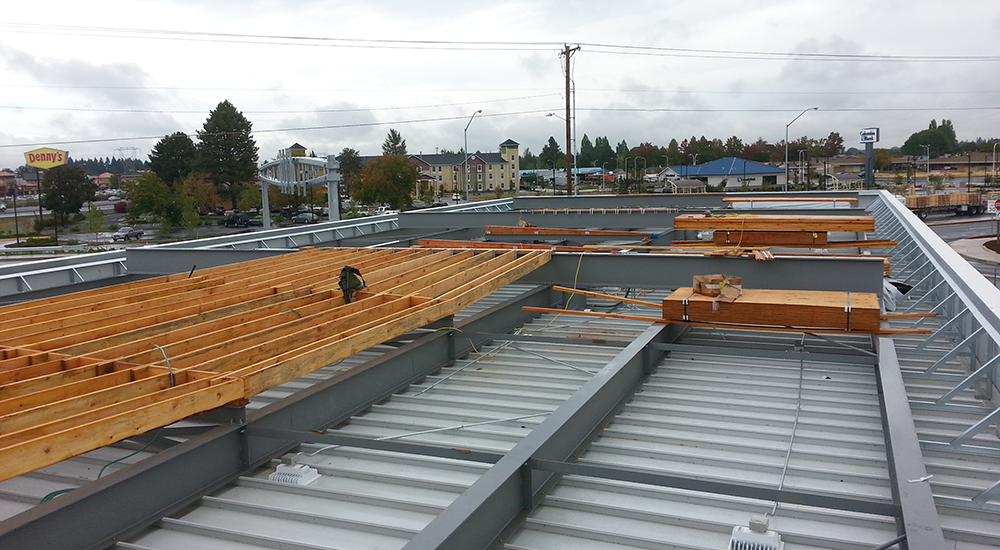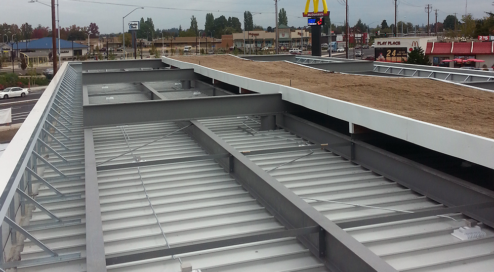 Ecoroofs Oregon assisted with concept development and design of these projects, and worked with the engineer to calculate the finish-weight of the entire assembly, framing, roofing, and ecoroof. The challenge was how to place 25 tons of ecoroof materials on top of a gas station canopy supported by four free-standing steel columns. As this was the first ecoroof for the City of Beaverton, we worked with the city on the stormwater facility aspects of the project, which offset the on-site landscape requirements, and facilitated the permitting and engineering of the project. Our scope of work included all framing above the steel canopy, membrane, roof drainage system, and irrigation.